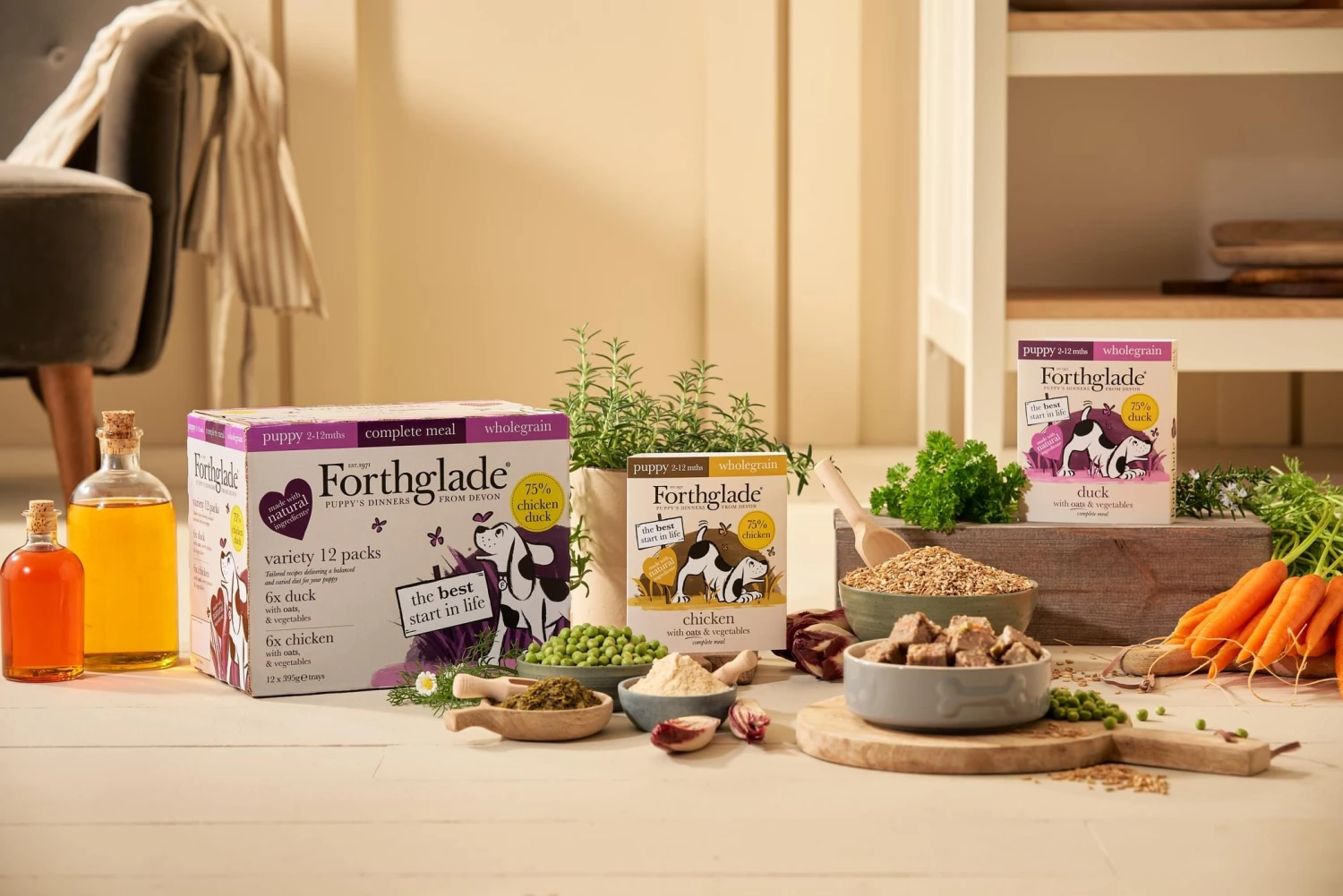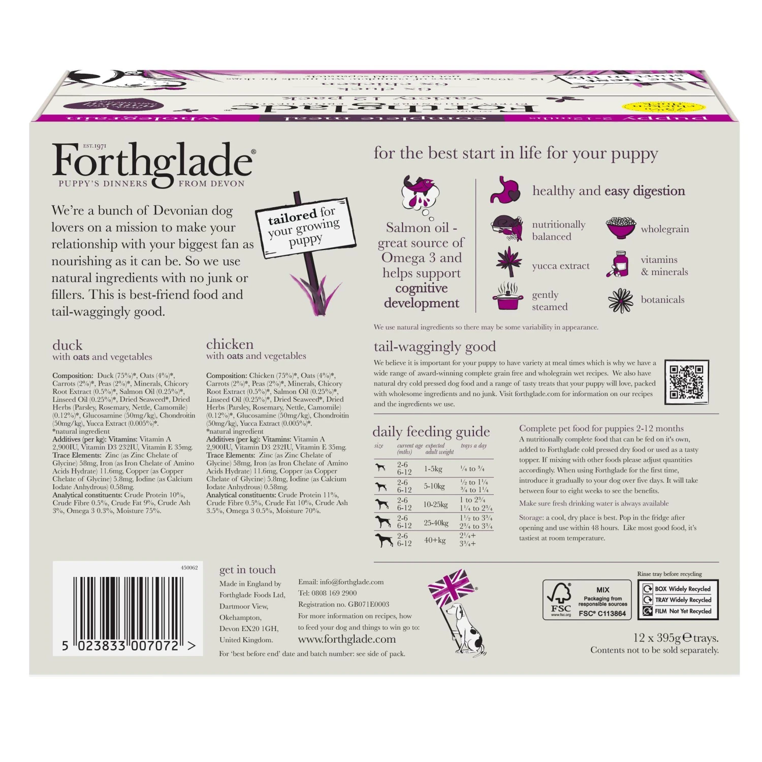 A nutritionally complete food that can be fed on it’s own, added to Forthglade cold pressed dry food or used as a tasty topper.If mixing with other foods please adjust quantities accordingly. When using Forthglade for the first time, introduce it gradually to your dog over five days. It’ll take between four to eight weeks to see the benefits. Make sure fresh drinking water is always available.