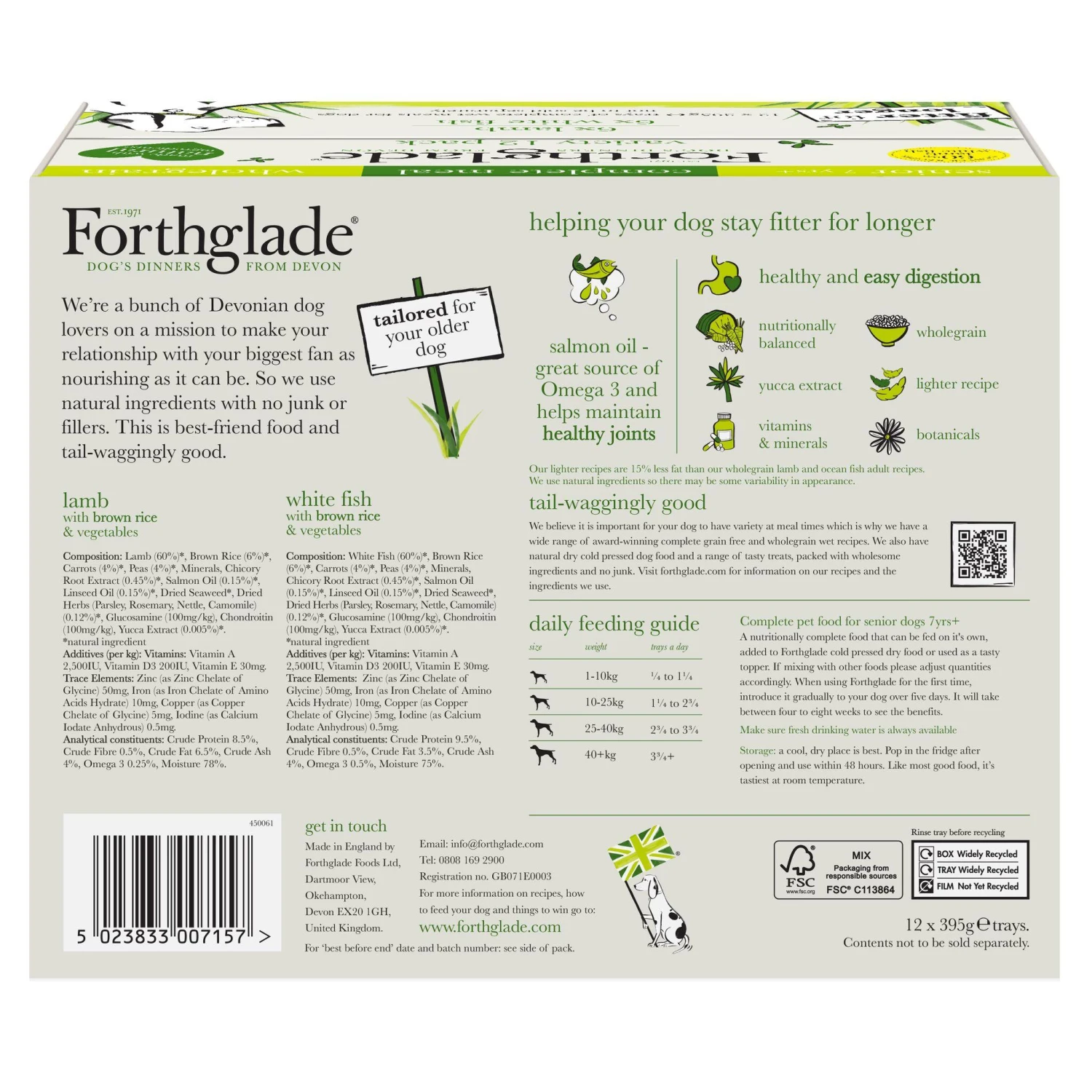 A nutritionally complete food that can be fed on it’s own, added to Forthglade cold pressed dry food or used as a tasty topper.If mixing with other foods please adjust quantities accordingly. When using Forthglade for the first time, introduce it gradually to your dog over five days. It’ll take between four to eight weeks to see the benefits. Make sure fresh drinking water is always available.