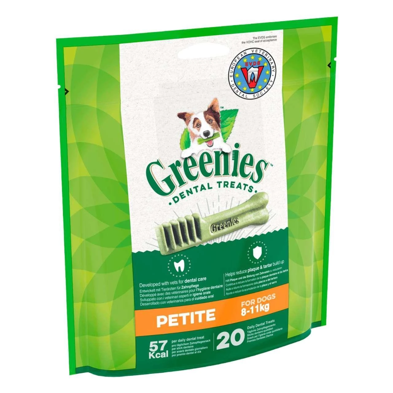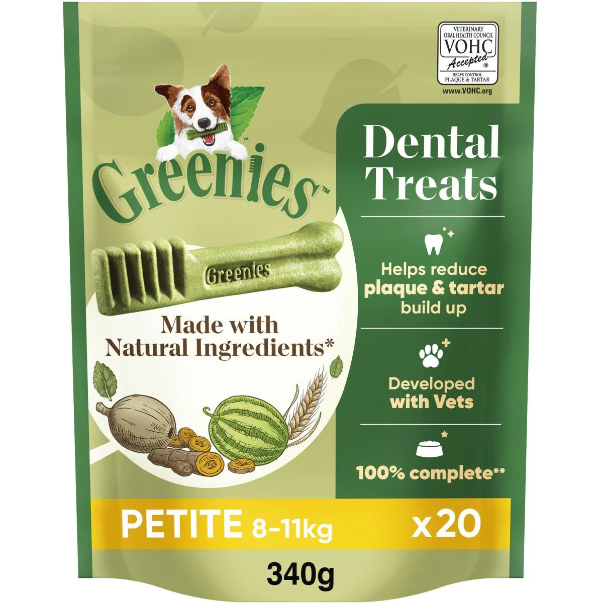 Greenies are designed for adult dogs and complement a balanced diet, they are low in fat and nutritionally complete. They are available in 4 sizes: Teenie, Petite, Regular and Large. It is important to choose the correct size for efficacy.
