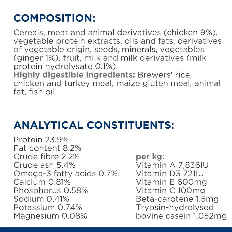 with Chicken: Brewers’ rice, maize starch, wheat, maize gluten meal, chicken (18%) and turkey meal, digest, flaxseed, dried beet pulp, minerals, animal fat, barley, oats, ginger root powder, soybean oil, vitamins, L-carnitine, milk protein hydrolysate, trace elements, taurine, and beta-carotene. With a natural antioxidant (mixed tocopherols).