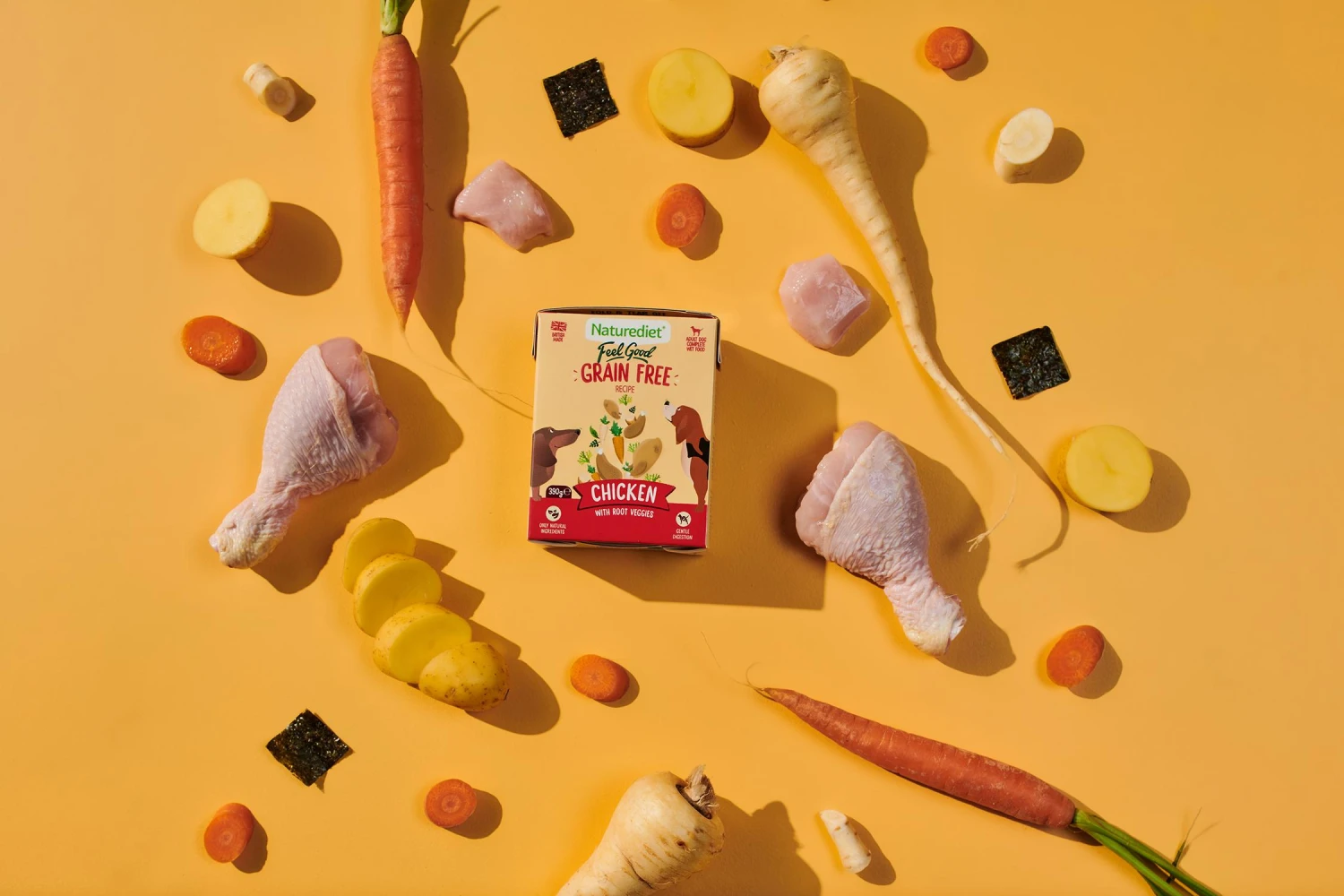 Chicken 60%, Carrot 3.5%, Potato 3.5%, Parsnip 3%, Dried Egg,Natural Ground Bone, Seaweed Meal, Vitamin A 3,300IU, Vitamin D3 275IU, Iron (as Iron (II) Sulphate Monohydrate) 13.2mg, Copper (as Copper (II) Sulphate Pentahydrate) 1.32mg, Manganese (as Manganous Sulphate Monohydrate) 2.2mg, Zinc (as Zinc Sulphate Monohydrate) 27.5mg