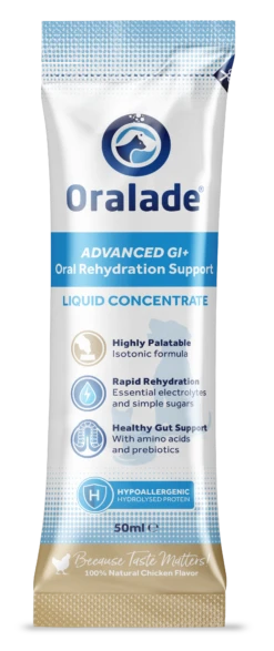 Oralade® GI+ is a highly palatable, natural roast chicken flavour ORS (Oral Rehydration Support) for dogs and cats which enables a balanced uptake of water, essential electrolytes, and simple sugars.