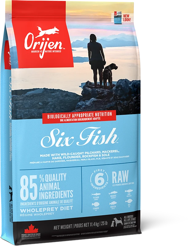 Help your dog thrive with the power of protein-rich recipes that provide peak nourishment. Dogs are ancestral carnivores, so they need a Biologically Appropriate diet rich and varied in whole animal ingredients. ORIJEN⢠Six Fish diet is made with a variety of succulent fish including raw* wild-caught pilchard, mackerel, hake, flounder, rockfish and sole. Packed with WholePrey animal ingredients like organs and bone, ORIJEN food is made with the most nutrient-dense, succulent parts of the prey to deliver the nutrition dogs need. With 85%** quality fish ingredients and a freeze-dried liver coating, this diet is beyond comparison.