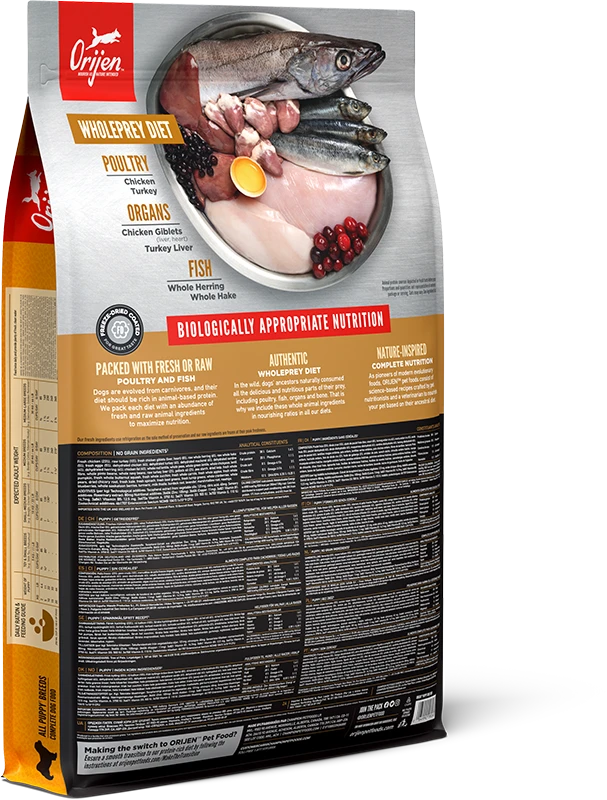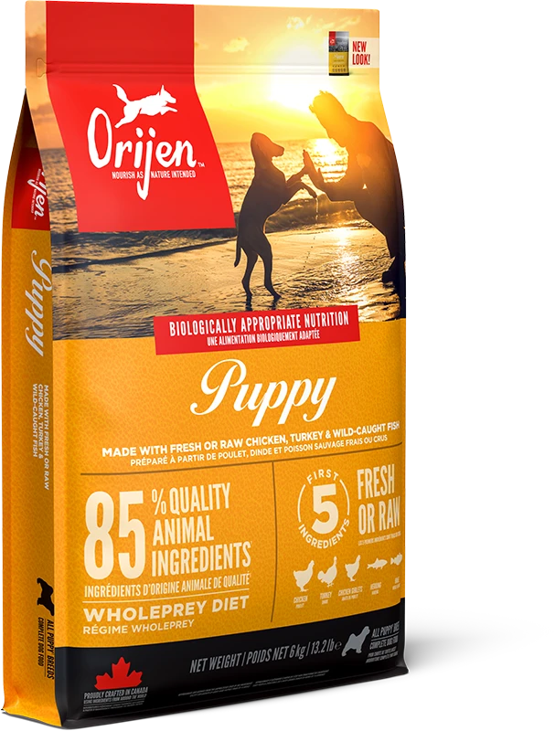 Help your puppy thrive with the power of protein-rich recipes that provide peak nourishment. All puppies do best on a Biologically Appropriate diet rich in protein and fat from quality animal ingredients to support their development. ORIJEN™ Puppy diet is packed with 85%* quality animal ingredients like fresh or raw free-run** chicken and turkey, and wild-caught or sustainably farmed fish. Packed with WholePrey animal ingredients like organs and bone, ORIJEN food is made with the most nutrient-dense, succulent parts of the prey to deliver the nutrition puppies need. The result is a diet for your canine companion that is beyond comparison.