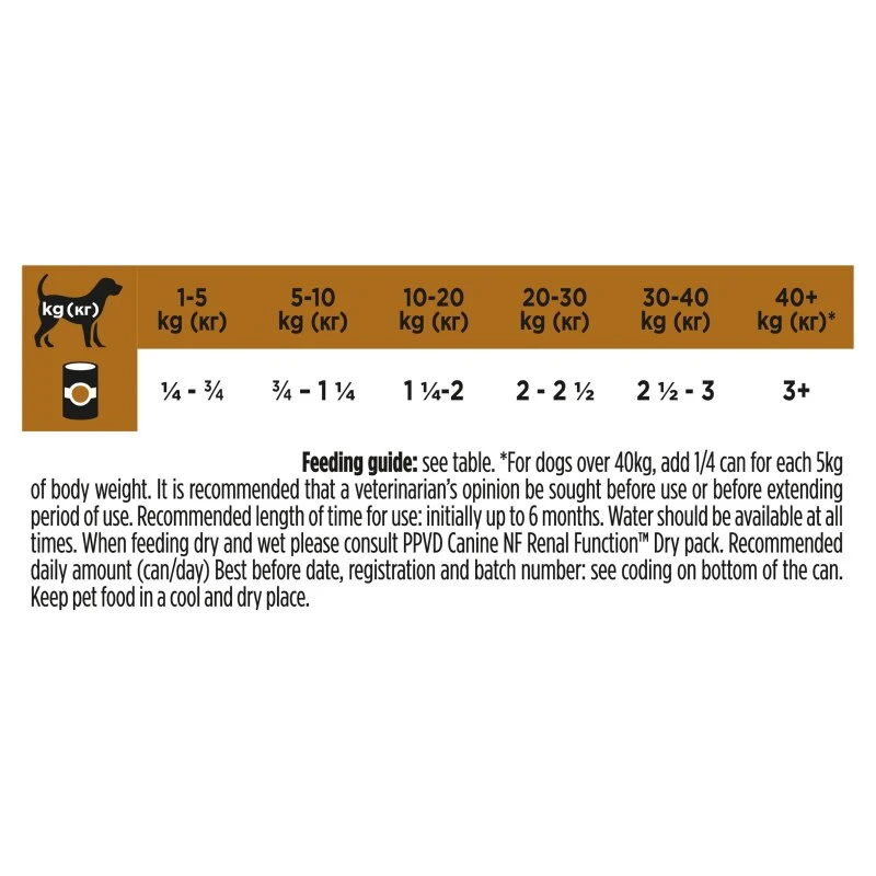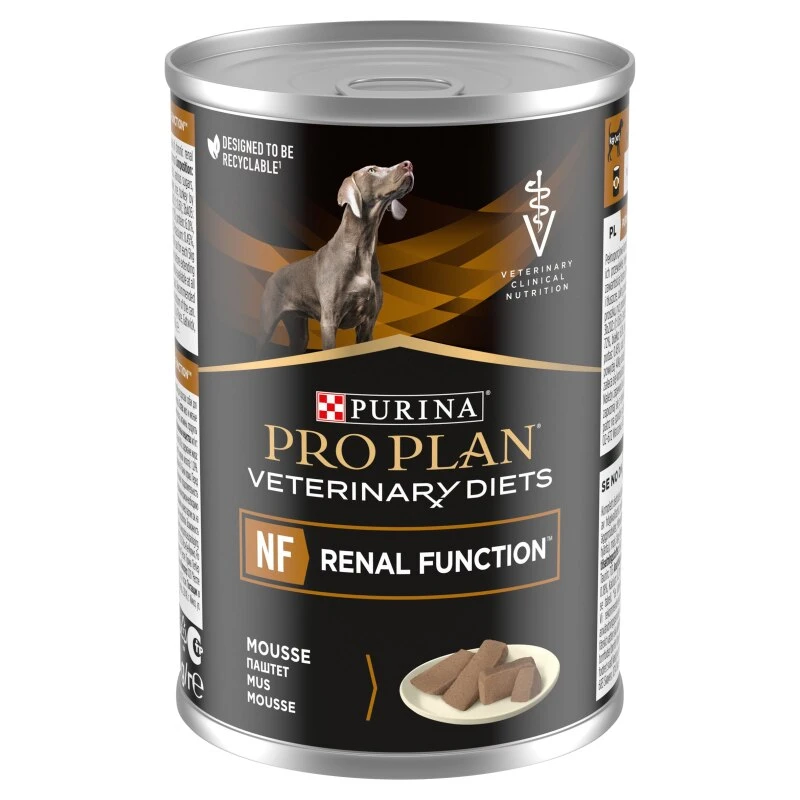 PURINA VETERINARY DIETS NF is a complete veterinary diet for dogs with chronic kidney disease. PVD NF contains restricted amounts of phosphorus as this mineral can build up in kidney patients and has been shown to contribute to progression of the disease. It also contains limited amounts of high quality protein to help reduce the build-up of toxins which make patients feel unwell, while helping to maintain muscle mass. Omega-3 fatty acids also help maximise the natural anti-inflammatory processes and reduce blood pressure inside the kidney. Note that PVD NF is not suitable for dogs that require a high protein/phosphorus diet diet such as pregnant bitches or growing puppies.