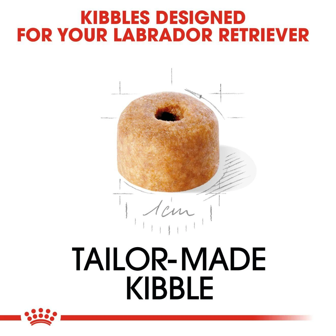 The kibble’s shape, size, texture and formula are adapted to the Labrador Retriever puppy.