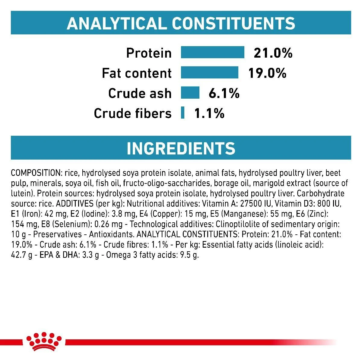 Composition: Rice, hydrolysed soya protein isolate, animal fats, hydrolysed poultry liver, beet pulp, minerals, soya oil, fish oil, fructo-oligo-saccharides, borage oil, marigold extract (source of lutein). Protein sources: hydrolysed soya protein isolate, hydrolysed poultry liver. Carbohydrate source: rice.