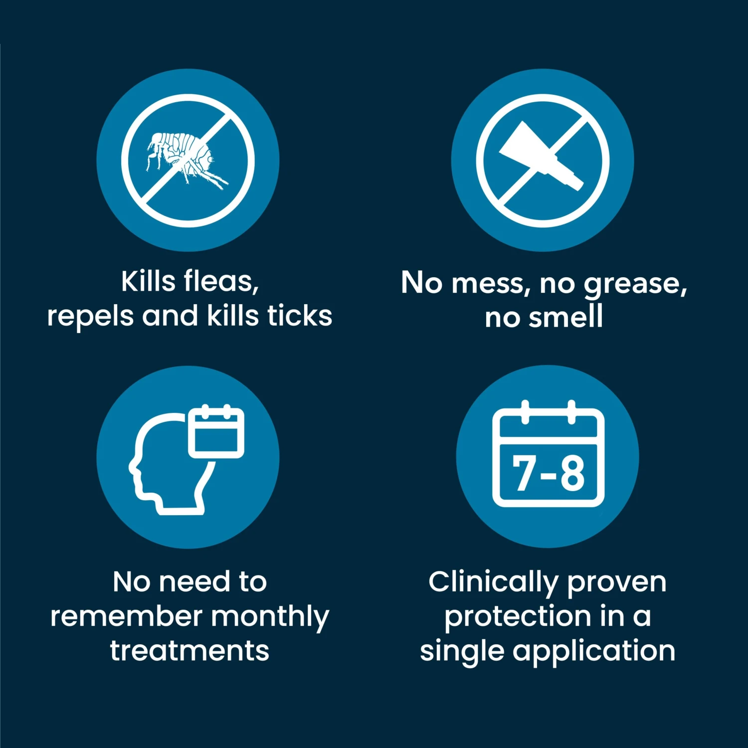 Up to 8 months’ continuous protection in a single application Kills fleas and repells and kills ticks without the need to bite your pet* Vet strength Water-resistant Odour-free |